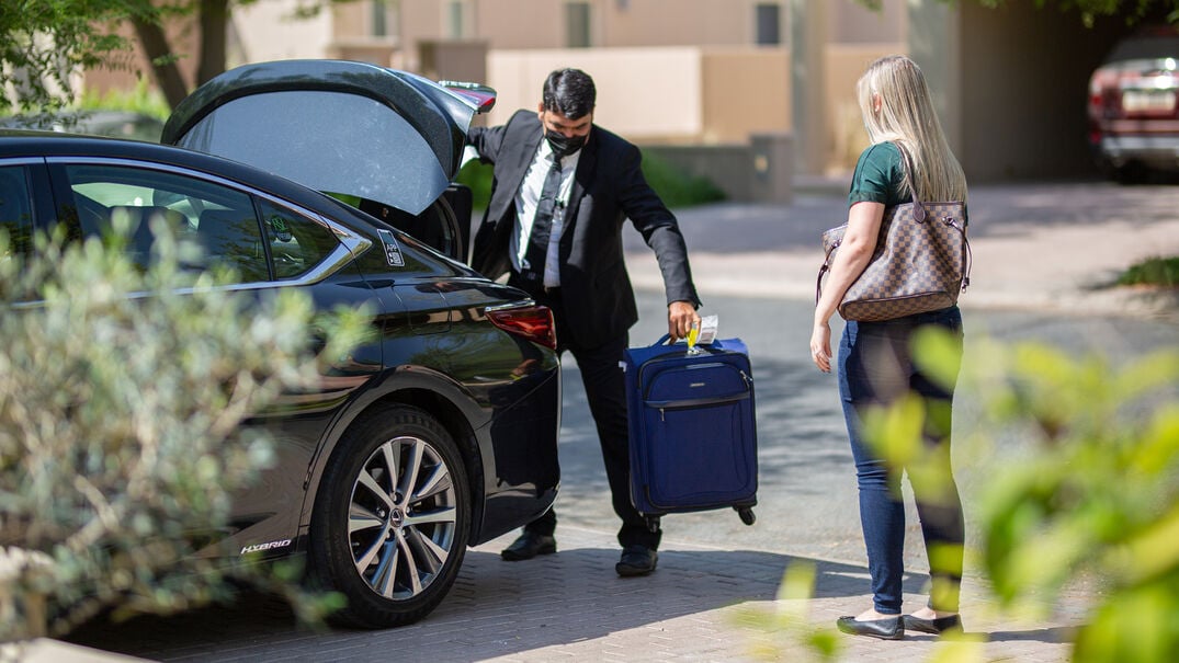 Chauffeur service is available from the airport to any point in the UAE and vice versa. Standard cars accommodate up to two passengers with three medium-sized pieces of luggage. All cars adhere to COVID safety requirements including sanitisation after every trip.